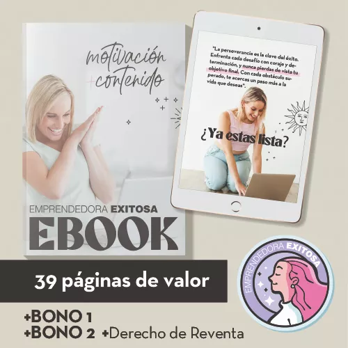 El ebook "Emprendedora exitosa" es un archivo PDF con 39 páginas de valor que tiene acceso a un archivo llamado "Guía Gratuita para un Instagram Exitoso" y viene con dos bonos más. Es decir que vas a tener accesos a 4 piezas digitales cargadas de valor.